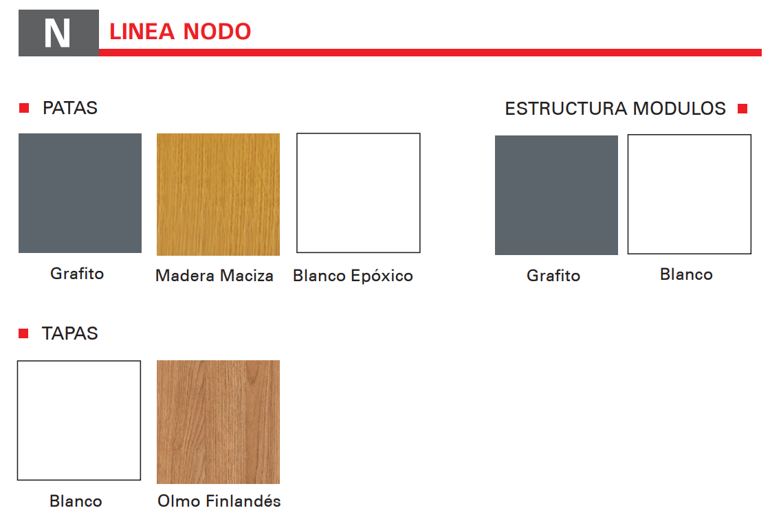 • Patas blancas, gris grafito o madera natural guatambú con acabado poliuretánico.